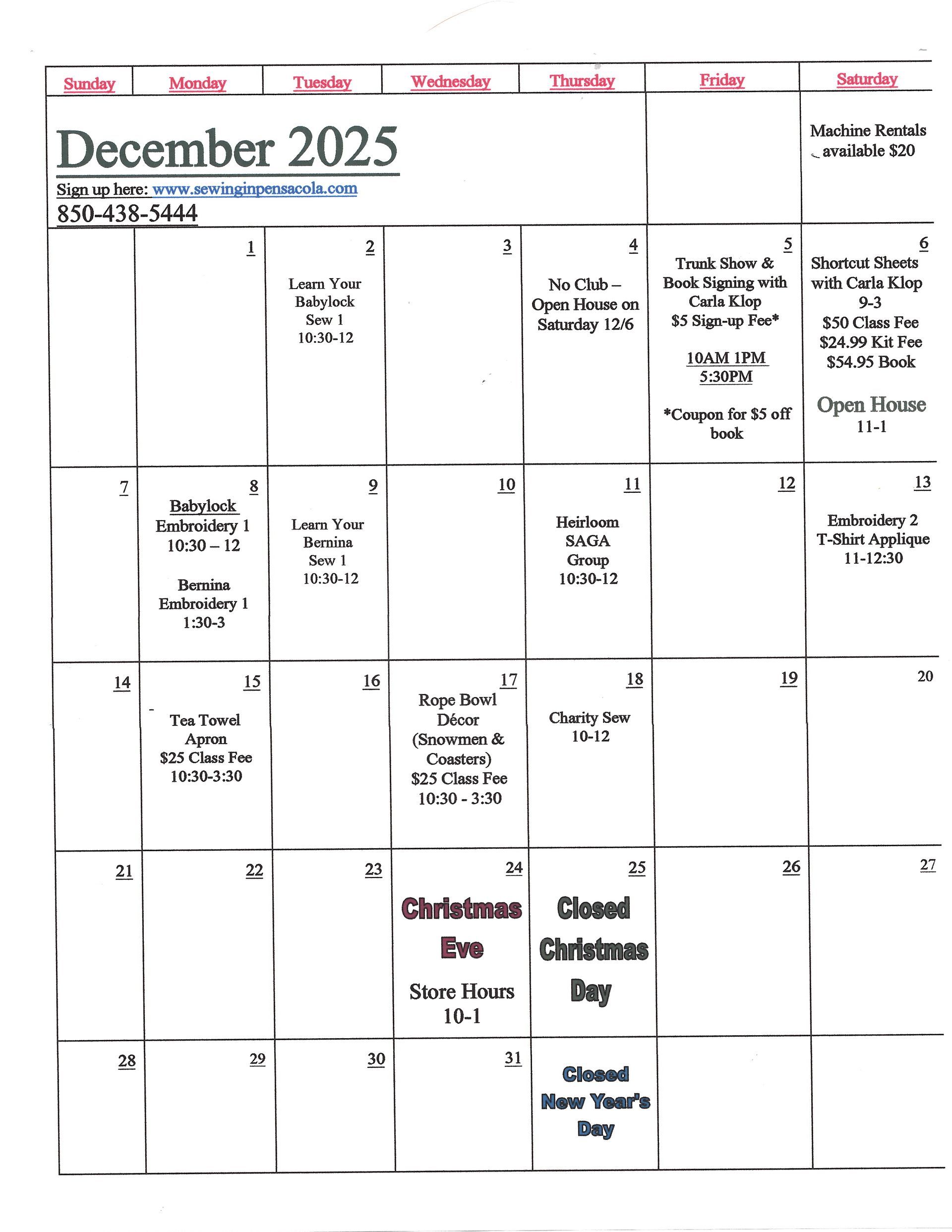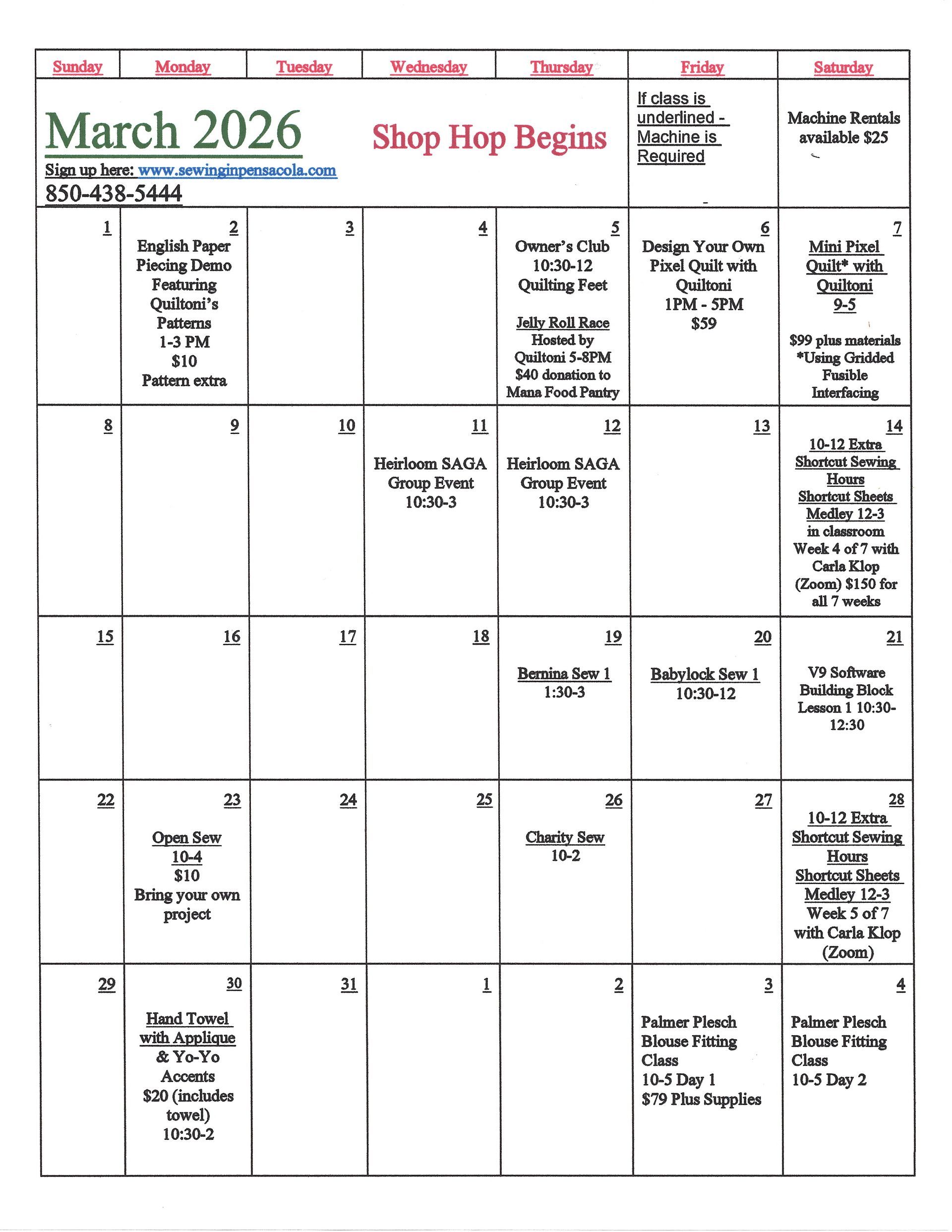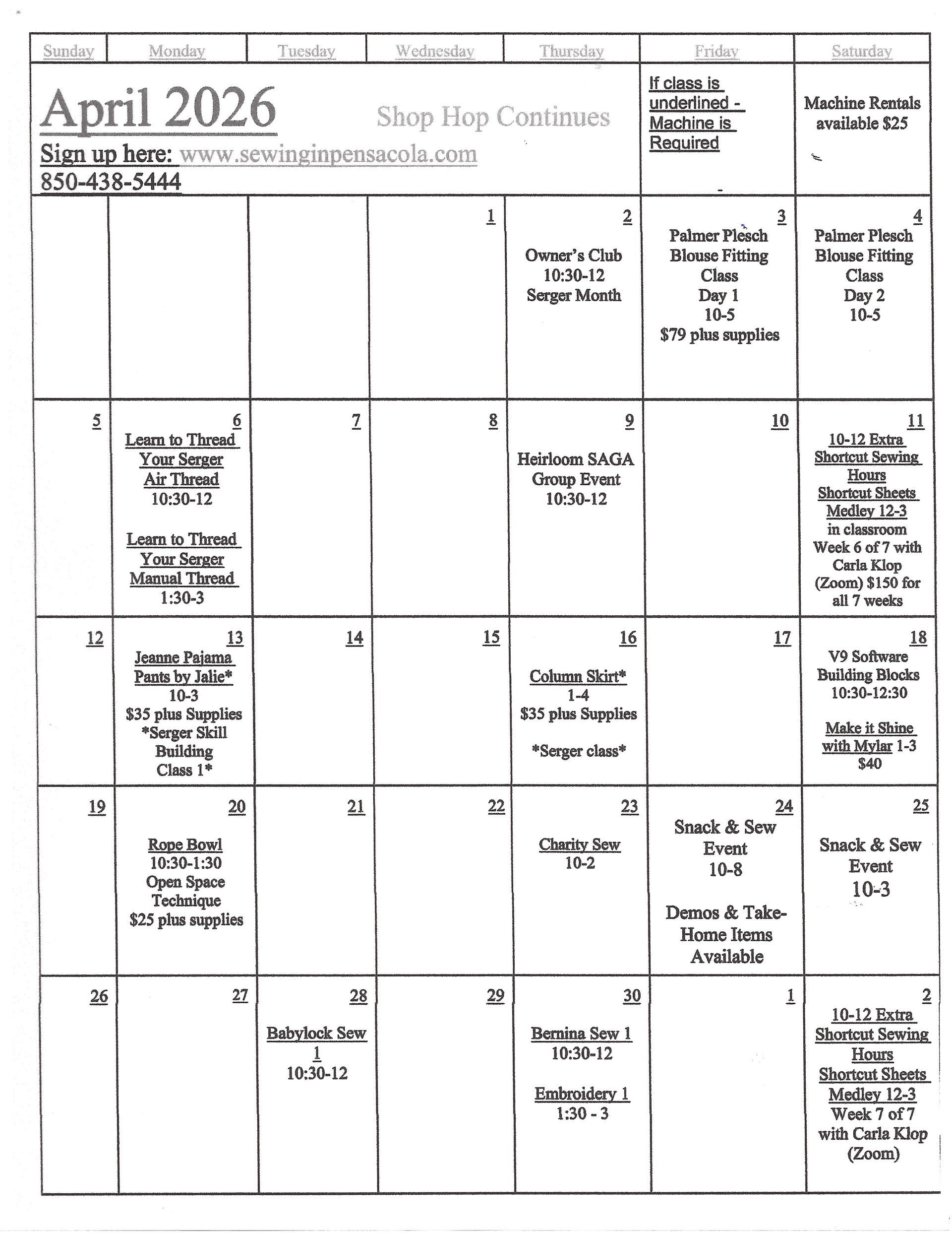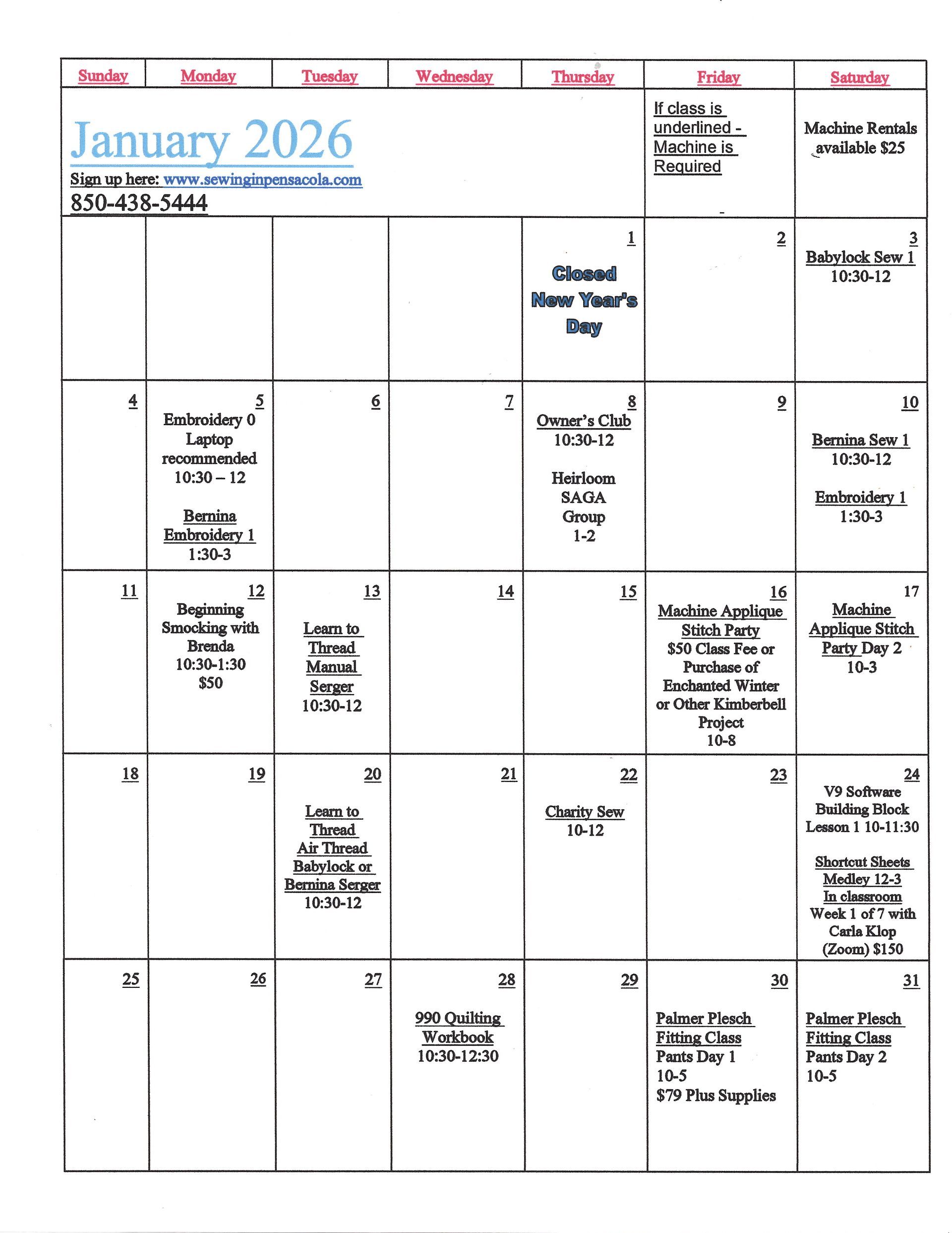 All attendees must provide own machine and materials, found in the class supply list, for each class.
